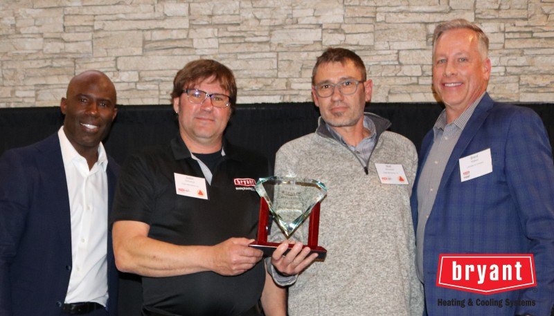Justin and Matt Schrawyer accept the 2019 Bryant Circle of Champions award at the 2020 Bryant dealer meeting. The 2020 Bryant dealer meeting included a special appearance and motivational speech by former Denver Broncos running back and Pro Football Hall of Famer, Terrell Davis.